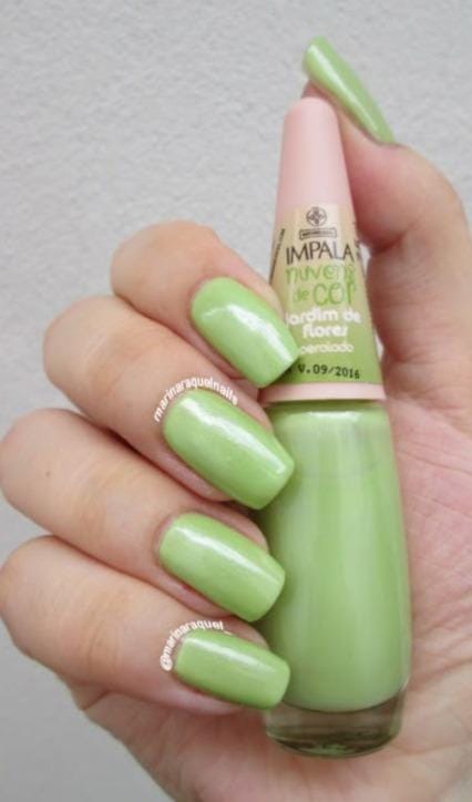 O verde acácia é a opção “diferente” da estação — um verde aberto, quase amarelado, que traz frescor e aparece nas cartelas Pantone. Para quem busca originalidade, o tom é ideal para nail art, detalhes ou aplicação completa. Combina com peças em coral, bege ou marrom claro.
