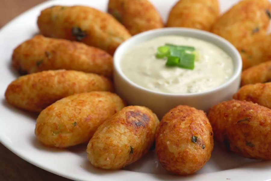 Versão cremosa e saborosa que combina arroz carolino, queijo parmesão e lascas de bacalhau cozido. A preparação pede que o arroz seja cozido com vinho e temperos, resfriado e moldado antes de fritar.