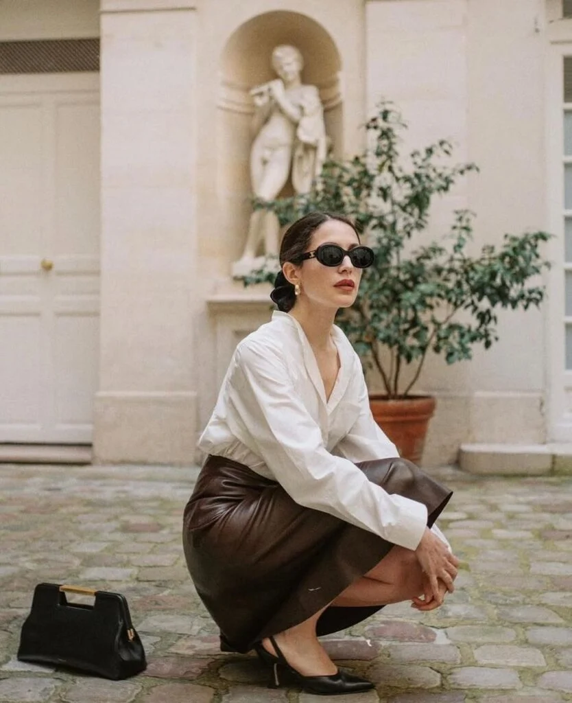 Outra opção para ocasiões mais formais é a combinação da camisa social com uma saia longa de couro. O contraste entre o tecido estruturado da saia e a leveza da camisa cria um visual elegante e moderno, ideal para jantares ou eventos noturnos.