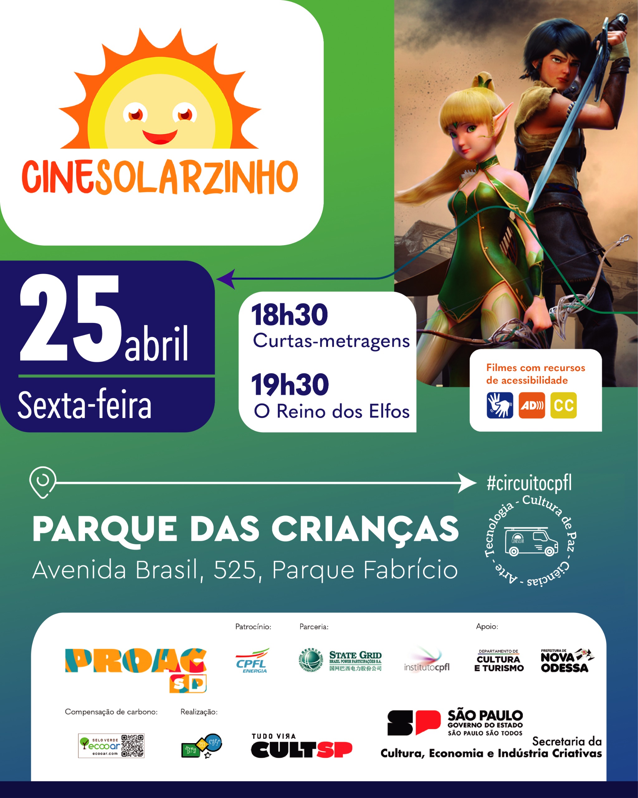 O Parque Municipal das Crianças em Nova Odessa recebe nesta sexta-feira (25/04), às 18h30, o CineSolarzinho, cinema ao ar livre voltado para o público infantil. O evento, que é gratuito e acessível, contará com a exibição de curtas-metragens ambientais e da animação ‘O Reino dos Elfos’, além de atividades para crianças de todas as idades.