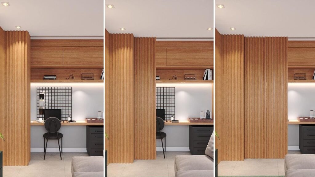Se você quiser camuflar o ambiente do home office no espaço, invista em portas, de preferência nas portas de correr, pois são práticas, otimizam o espaço e, quando abertas, podem permitir a integração dos ambientes da casa, deixando o espaço com uma sensação de amplitude.