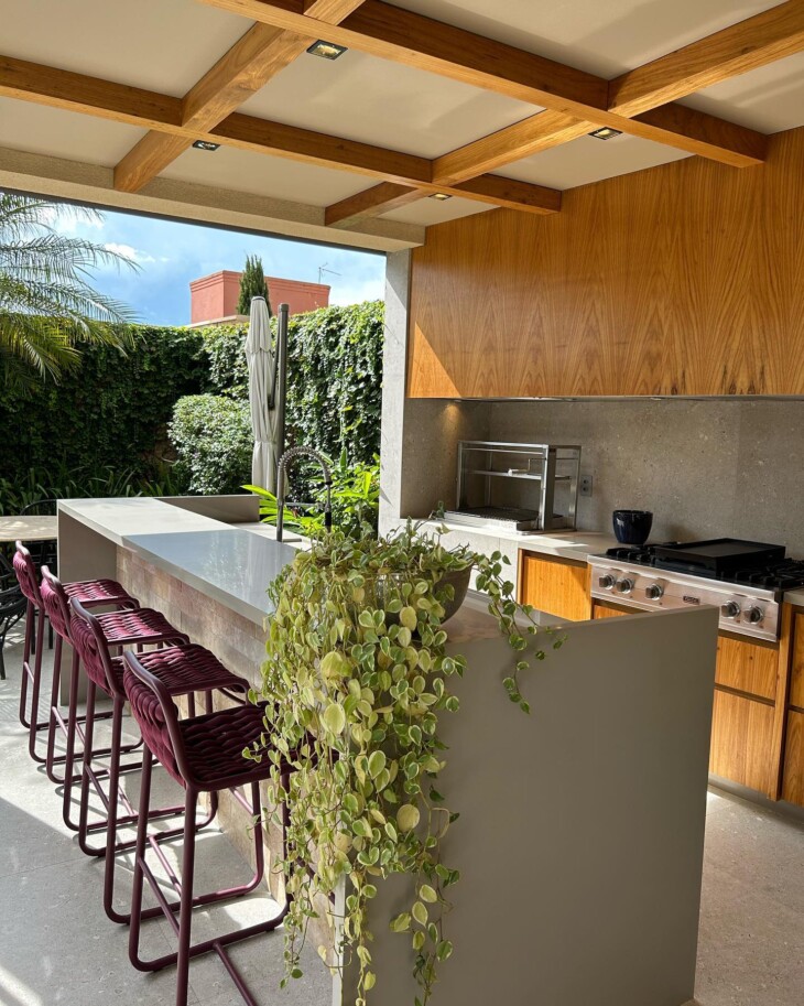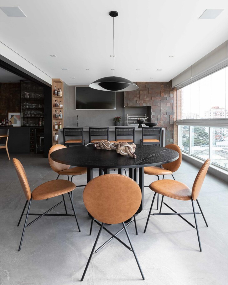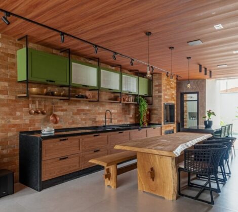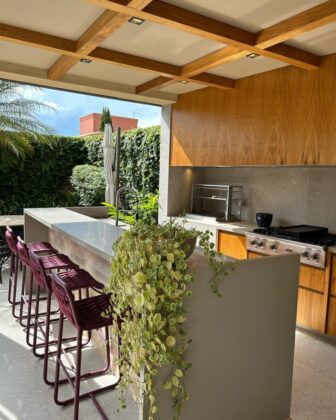 Escolha revestimentos que sejam resistentes ao calor e fáceis de limpar. O porcelanato é uma opção durável, enquanto as pedras naturais trazem um toque rústico e são de fácil manutenção. O importante é que o estilo escolhido harmonize com o restante da decoração.