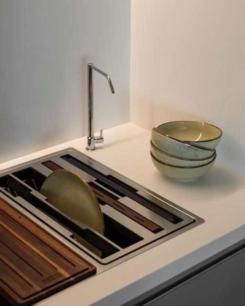 Calhas úmidas e secas respondem a finalidades diferentes: as úmidas substituem o escorredor tradicional, integrando-se à cuba e permitindo escoamento direto; as secas funcionam como canaletas para apoiar utensílios e temperos.