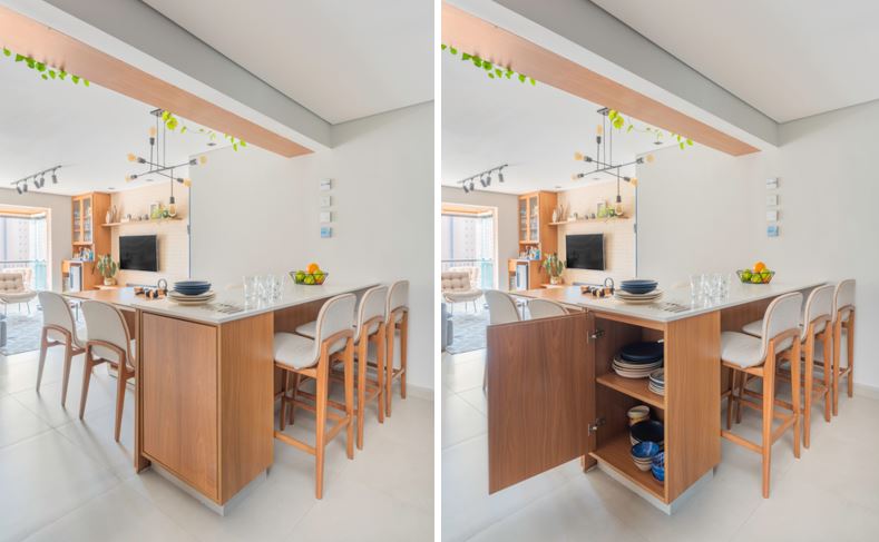 Segundo o arquiteto, além da funcionalidade, a presença de ilhas e penínsulas estimula a socialização e torna o espaço mais convidativo e menos isolado.