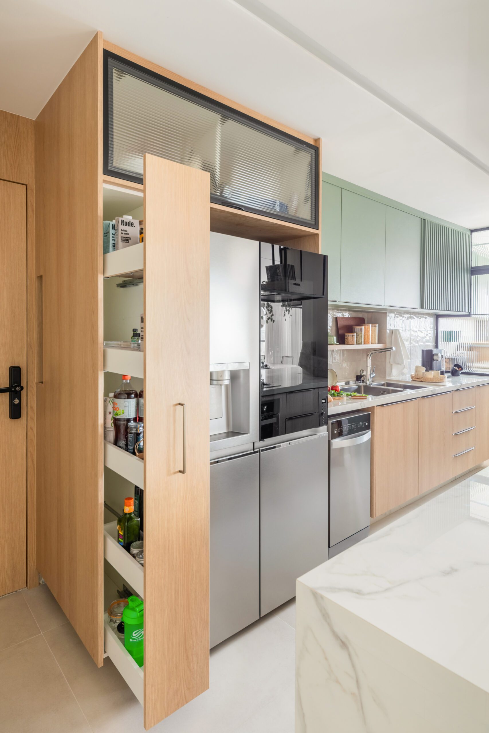 A marcenaria orienta o layout e facilita a organização diária. Gavetas com divisórias ajustáveis, gavetões amplos e portas basculantes com pistão a gás tornam o acesso aos itens mais rápido e ergonômico.