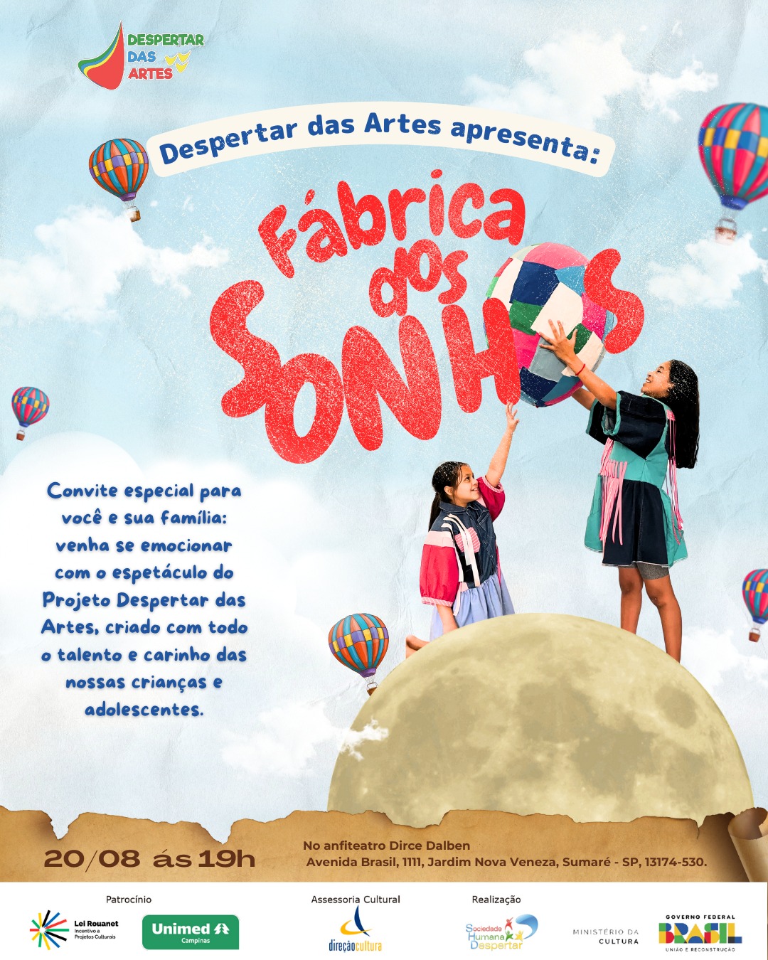 Crianças e jovens do projeto Despertar das Artes, da Sociedade Humana Despertar (SHD), apresentam o espetáculo inédito “A Fábrica de Sonhos (Que não cabem em caixa)” no dia 20 de agosto de 2025, às 19h, no Anfiteatro do Seminário de Nova Veneza, em Sumaré. A classificação é livre e a entrada é franca.