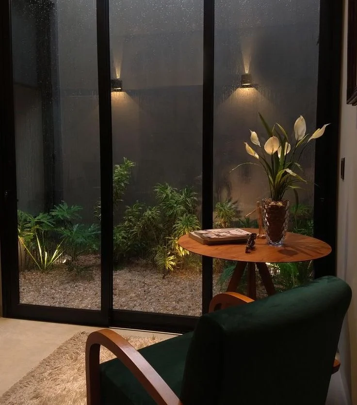 Não se esqueça de que o jardim de inverno deve ser bem iluminado, tanto para valorizar seu design durante o dia quanto para ser aproveitado à noite. A inclusão de luminárias, arandelas ou luzes embutidas pode trazer um toque especial à decoração, tornando o espaço ainda mais convidativo.