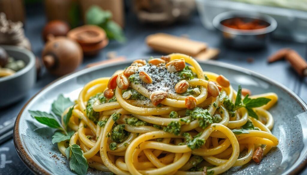 | Talharim ao Molho Pesto | 500g talharim (massa sem ovos e sem leite) 200g espinafre em folhas 4 nozes 1 dente de alho Azeite Suco de ½ limão tahiti Sal Pimenta do reino | Cozinhe o talharim em água com um pouco de sal até que fique al dente. Escorra e reserve. No liquidificador ou processador, coloque todos os ingredientes do molho e bata até ficarem bem triturados. Despeje o molho sobre o talharim e sirva. |