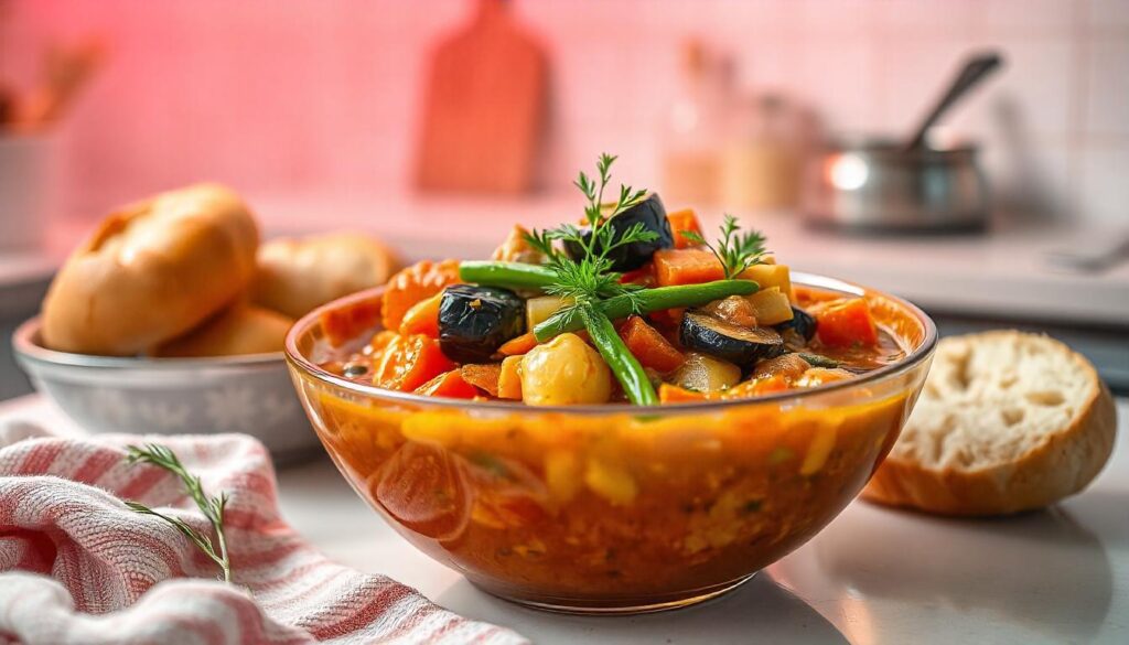 | Estrogonofe de Legumes | 550g abobrinha 600g batata 130g cebola 600g cenoura 500g vagem macarrão 1,4kg abóbora cabotiã 600g brócolis Sal 1 litro de leite vegetal 200g de farinha de trigo Óleo de coco 2 colheres de catchup vegano 2 colheres de mostarda vegana Batata palha (frita em óleo de palma) | Corte os legumes em cubos e cozinhe cada um separadamente em água. Reserve. Refogue a cebola picada no óleo de coco, acrescente a farinha e o leite vegetal e ajuste o sal. Adicione os legumes, deixando a abóbora e o brócolis por último. Coloque catchup e mostarda a gosto e finalize com batata palha na hora de servir. |