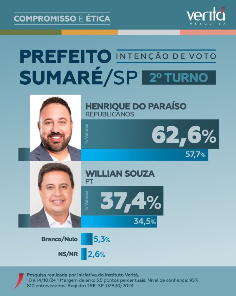 O Instituto Veritá divulgou os resultados de uma pesquisa de intenção de votos para o cargo de prefeito na cidade de Sumaré (SP). A pesquisa entrevistou 810 pessoas e trouxe os seguintes resultados: