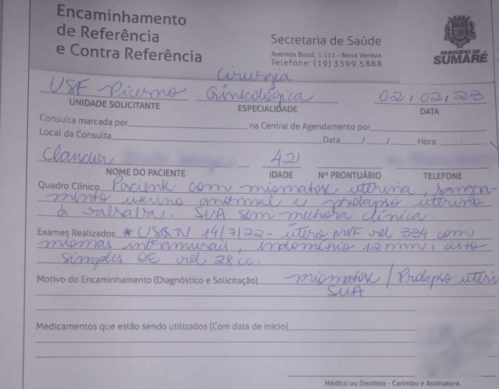 O encaminhamento foi perdido dentro da burocracia e da ineficiência do sistema de saúde de Sumaré. Em 2023, Claudia precisou fazer um novo encaminhamento e, até o momento, continua sem resposta. “Aí eu fico todo ano, só fazendo exame e exame, para acompanhar a evolução do cisto e esperando, orando a Deus para ser chamada um dia”, comentou Claudia.