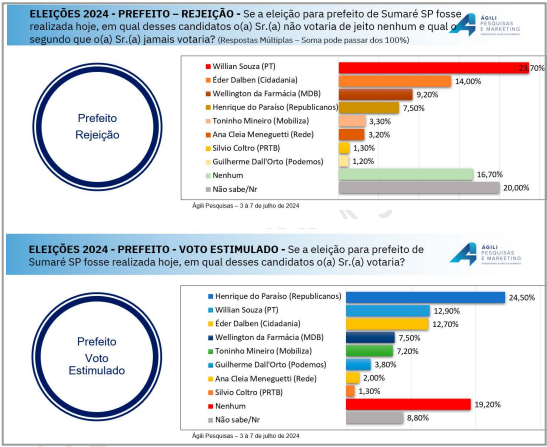 Entre os dias 3 e 7 de julho, 600 eleitores de Sumaré maiores de 16 anos foram ouvidos. A margem de erro é de 4% para mais ou para menos e está registrada no TSE pelo número SP-09779/2024.