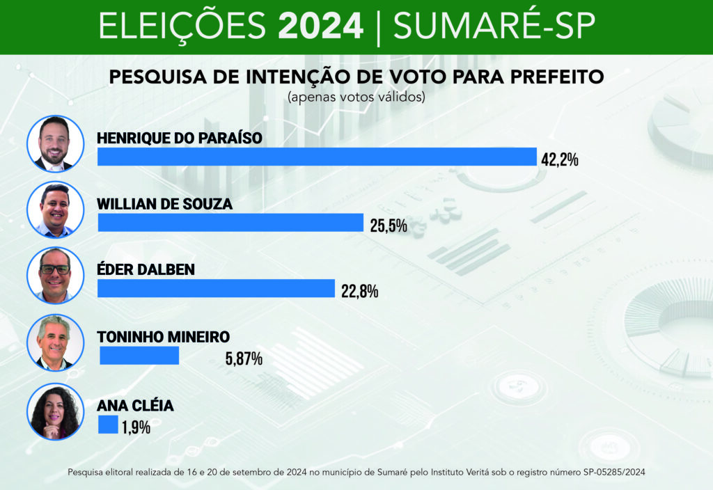 Uma nova pesquisa eleitoral realizada pelo Instituto Veritá revelou que Henrique do Paraíso (Republicanos) está à frente na corrida pela prefeitura de Sumaré, com uma disputa acirrada entre Willian Souza (PT) e Eder Dalben pelo segundo lugar.