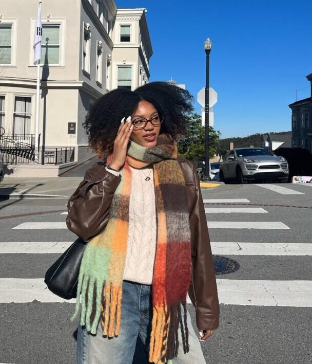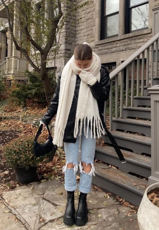 Outra alternativa para valorizar o cachecol é investir em produções com tons contrastantes. Por exemplo, uma jaqueta preta combinada com coturno escuro pode realçar ainda mais o acessório, criando um visual marcante e cheio de atitude.