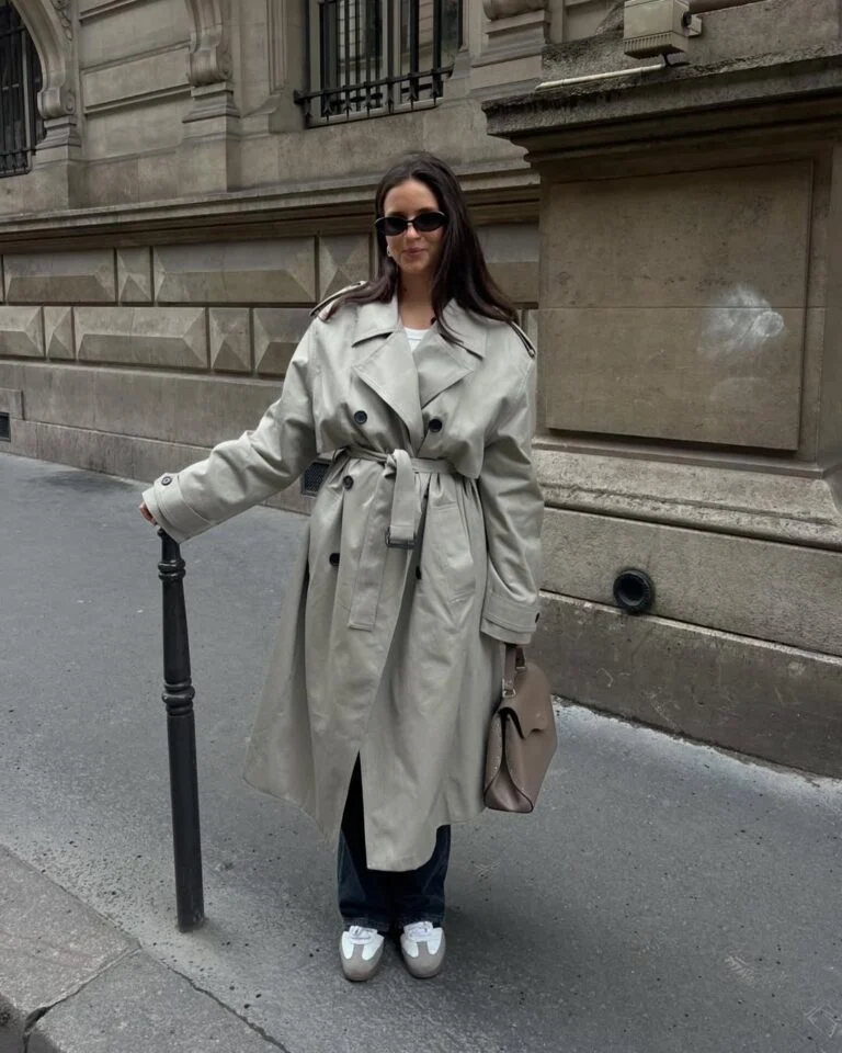 Para enfrentar temperaturas mais baixas com estilo, a combinação de trench coat alongado com calça jeans é uma aposta certeira. O tênis Adidas Samba complementa o visual, oferecendo conforto e um toque esportivo sofisticado.