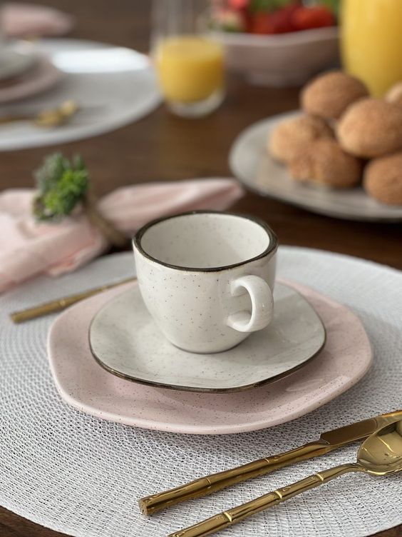 Guardanapos de tecido, especialmente em tons neutros e com argolas, transformam a aparência da mesa sem esforço. Itens como tigelas, bules, travessas e jarras de suco são formas práticas de adicionar cor sem comprometer a base neutra.