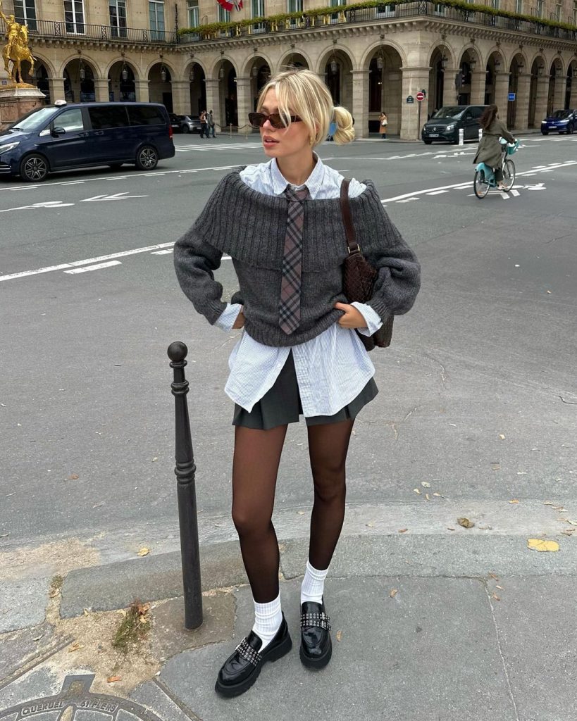 Este look está cheio de informação de moda: a camisa social branca, a gravata, o tricô ombro a ombro, a presença da cor cinza, a minissaia plissada, a meia-calça, a meia aparente branca e, claro, o mocassim! Por isso, se você se identifica com a proposta urbana, vale reproduzir o outfit com as peças que você já tem no armário.