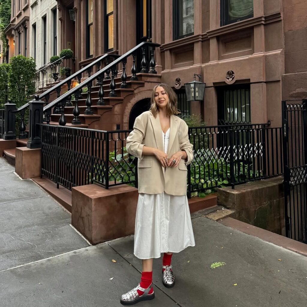Se quiser formalizar, opte por blazer estruturado e sandálias neutras, mantendo proporções equilibradas entre o comprimento do vestido e o caimento do blazer.