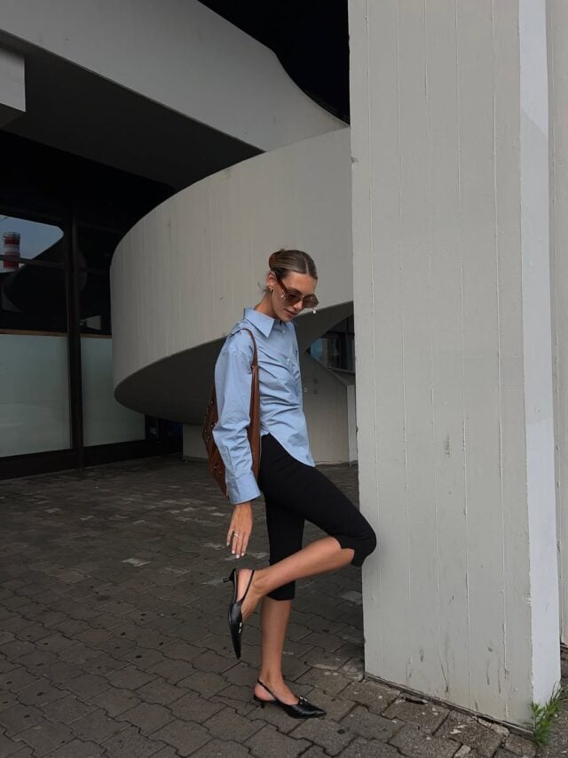 A calça capri “voltou com tudo” e é aposta para um escritório fashionista e atualizado. Para dar mais formalidade, combine com camisa de manga longa e acessórios minimalistas.
