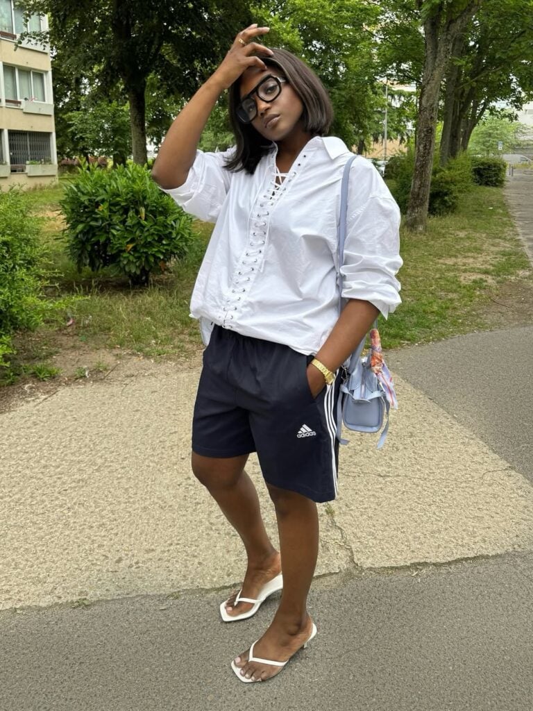 Para looks mais descontraídos, o short esportivo cria um contraste despojado com o acabamento do kitten heels. O resultado são combinações versáteis, que permitem diferentes escolhas de parte de cima.