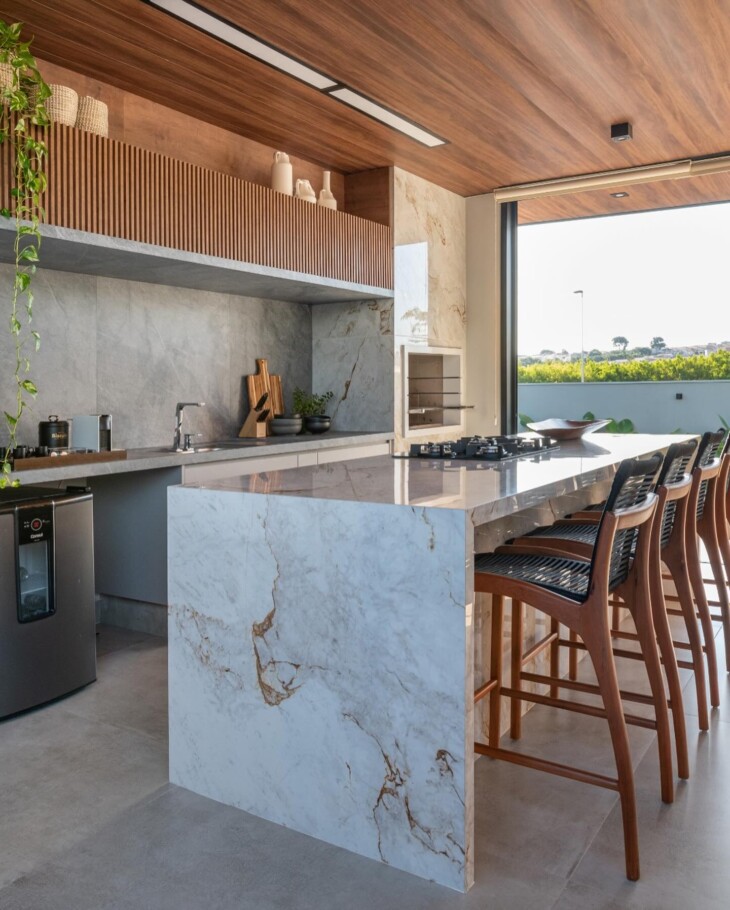 Ao escolher o revestimento para a churrasqueira, opte por materiais que sejam resistentes ao calor e fáceis de limpar. O porcelanato é uma excelente escolha, pois é durável e de fácil manutenção, com diversas opções de cores e padrões disponíveis. As pedras naturais também são ideais, oferecendo resistência, baixo custo de manutenção e um toque rústico. Busque um estilo que harmonize com a decoração do restante do espaço.