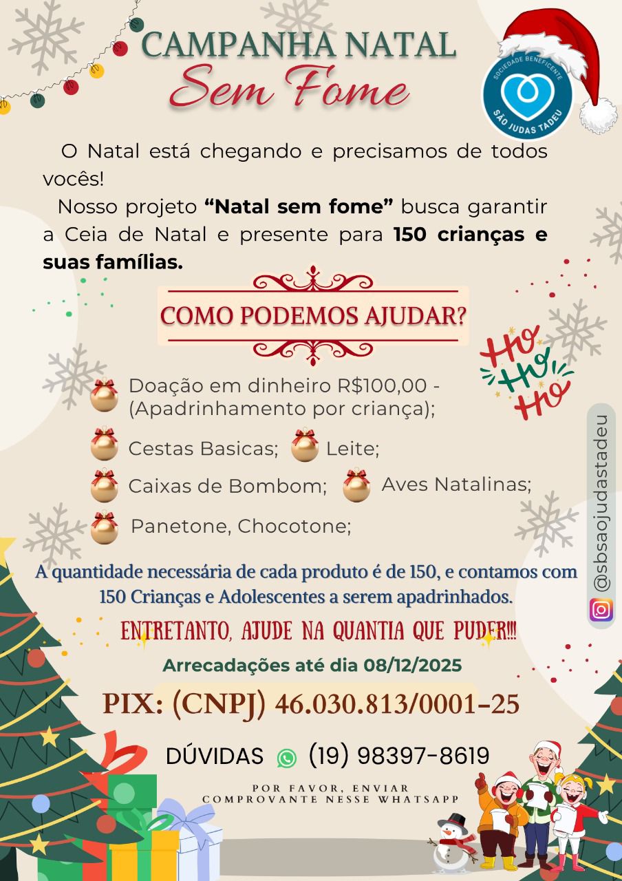 A Sociedade São Judas Tadeu, com o apoio da Secretaria Municipal de Inclusão, Assistência e Desenvolvimento Social (SMIADS), deu início à Campanha Natal Sem Fome em Sumaré, criada em 2020 para proporcionar um Natal mais digno às famílias em situação de vulnerabilidade social. As arrecadações serão realizadas até o dia 8 de dezembro.