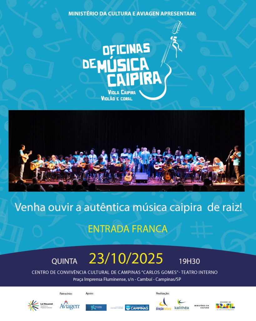 O projeto Oficinas de Música Caipira, de Campinas, apresenta repertório de música de raiz no Teatro do Centro de Convivência Cultural de Campinas em 23/10/2025, às 19h30. A entrada é franca.