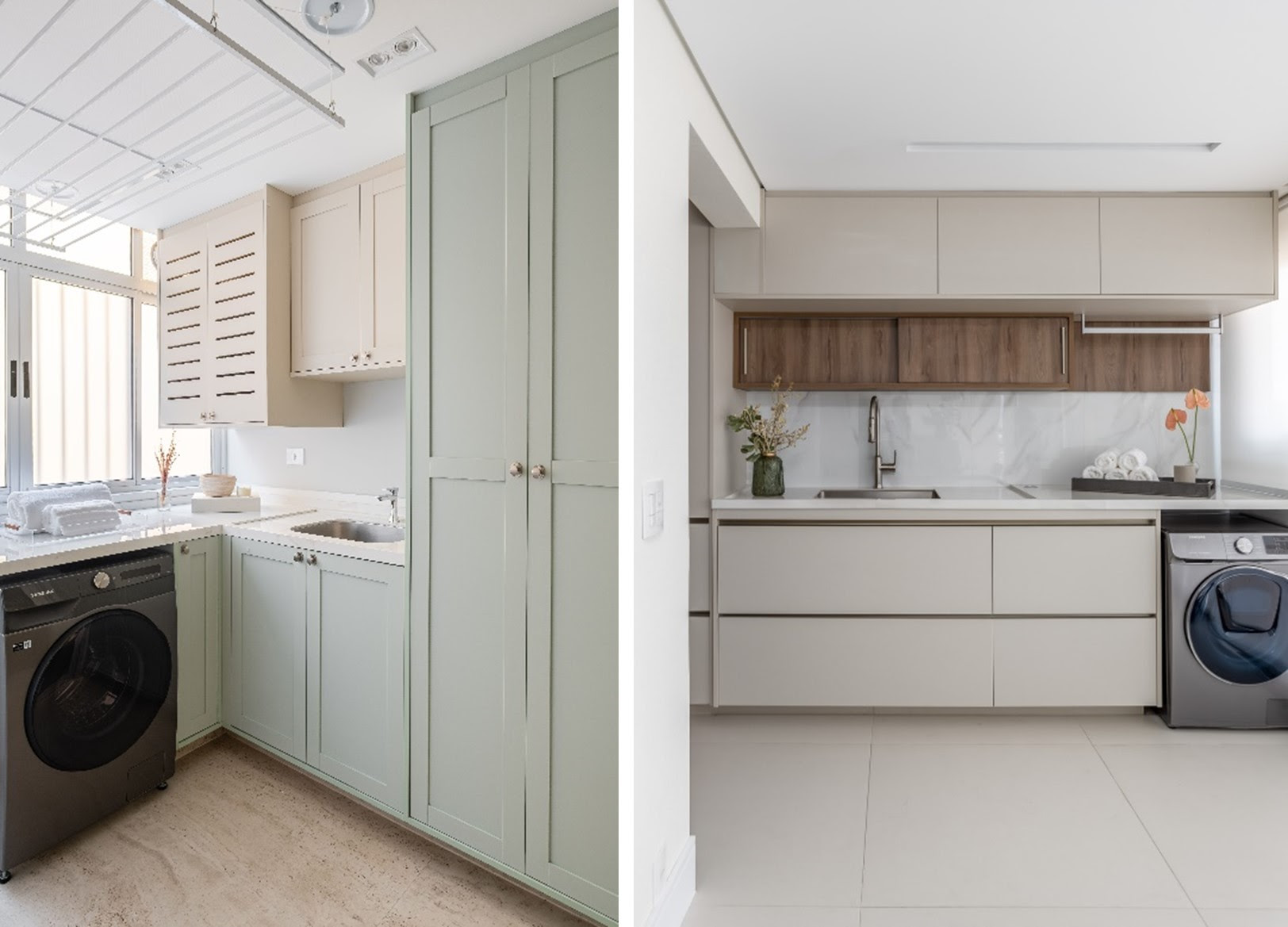 Apesar da popularidade das lavanderias compartilhadas em condomínios, a autonomia de ter uma área de serviço própria voltou a ser prioridade. Em apartamentos compactos, é possível incluir lava e seca, armários e bancada com tanque, garantindo privacidade e praticidade.