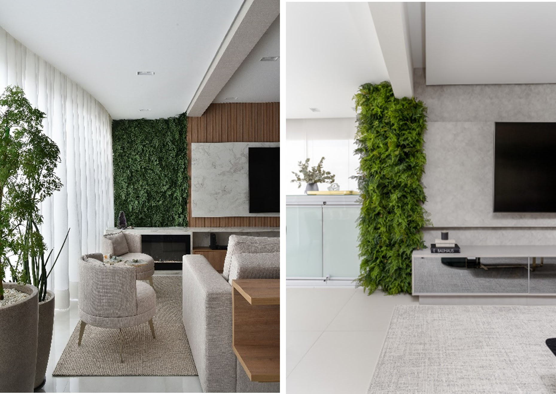 A proximidade com a natureza é um desejo constante. Os jardins verticais surgem como soluções charmosas e funcionais, que realçam a textura e naturalidade do ambiente, complementando a madeira e trazendo vida e cor aos espaços internos.