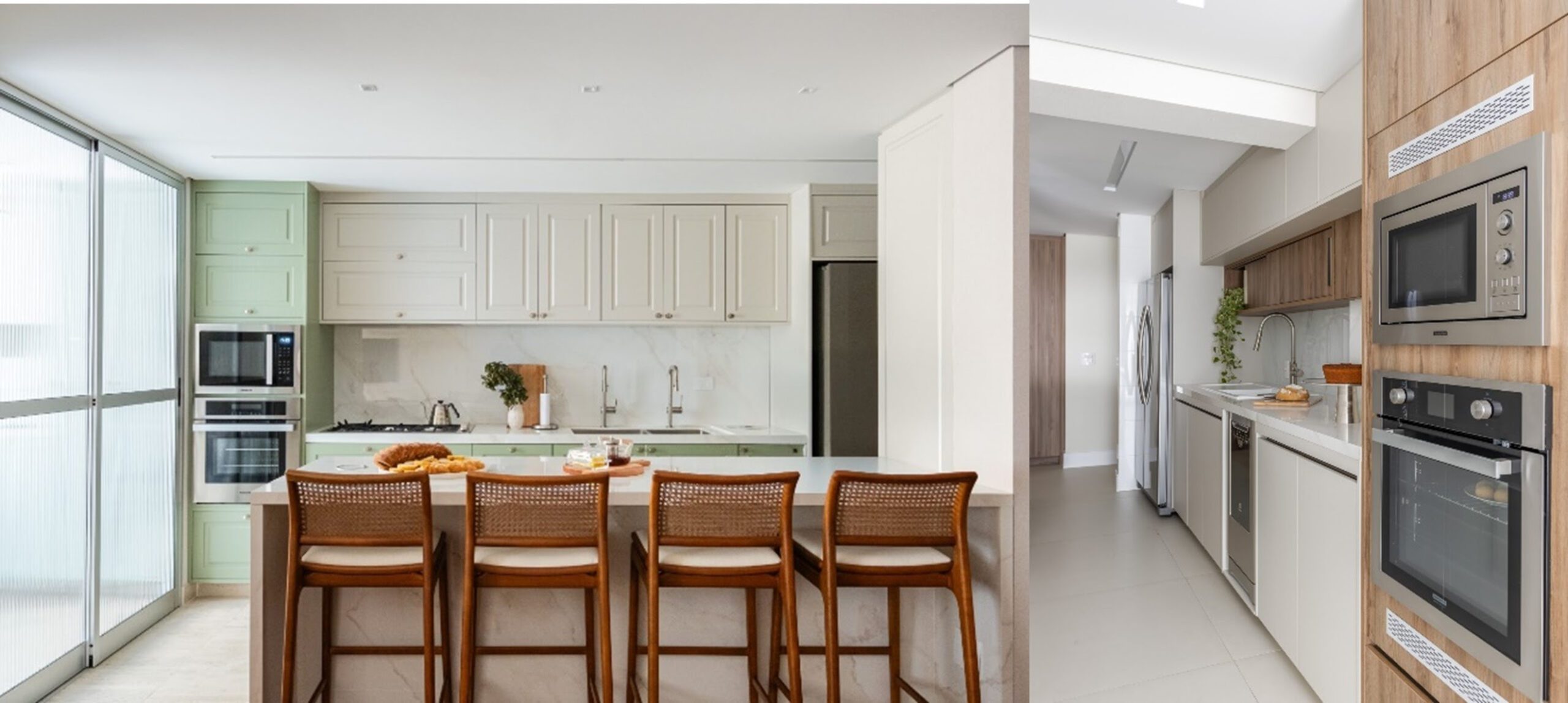 Centralizar o micro-ondas e o forno embutidos na marcenaria, conceito conhecido como “torre quente”, é uma solução que alia ergonomia e aproveitamento eficiente do espaço. Segundo Fabiana, essa configuração torna a cozinha mais funcional e alinhada ao estilo de vida moderno.