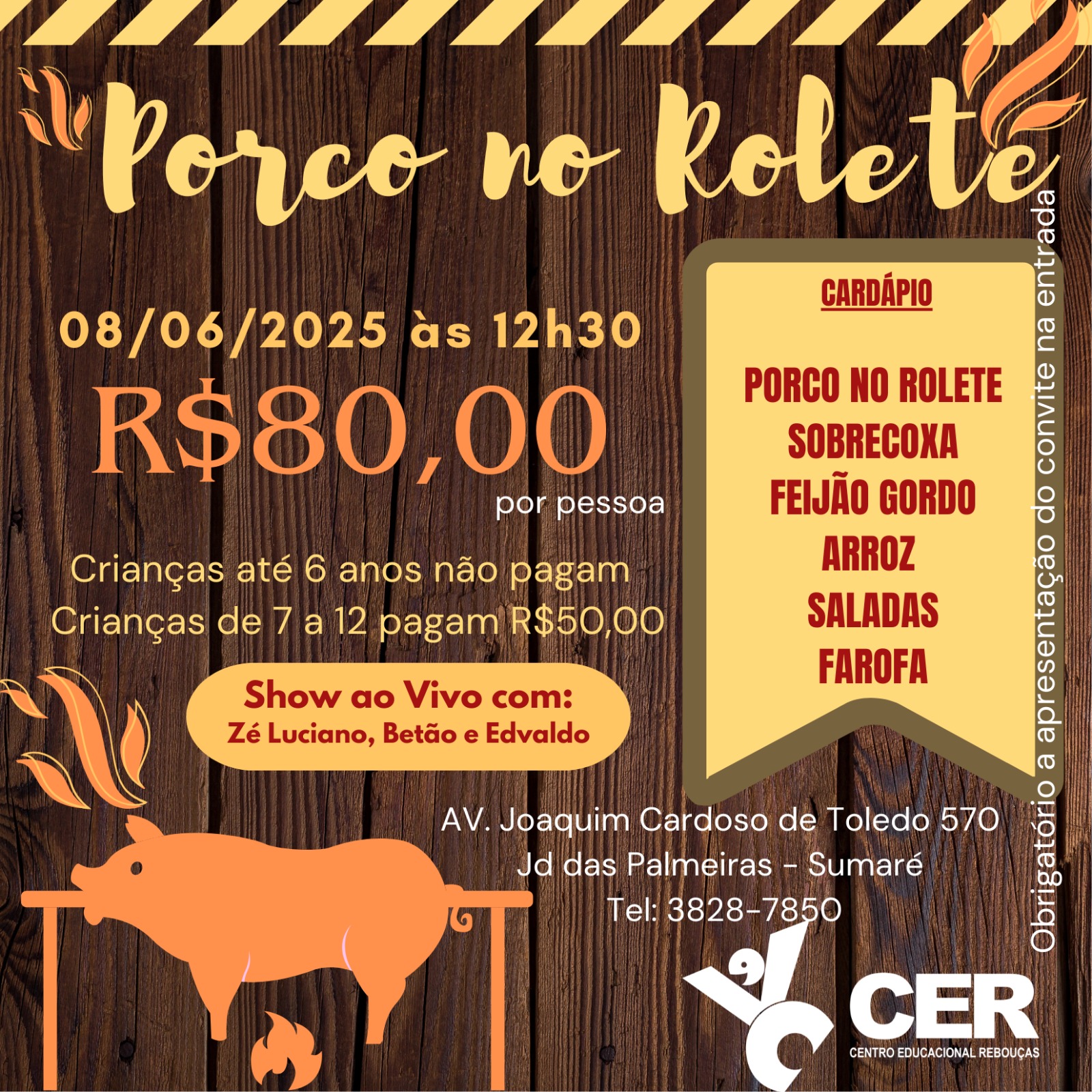 O Centro Educacional Rebouças (CER) realiza em Sumaré, no dia 8 de junho, a tradicional edição do Porco no Rolete, evento beneficente que une solidariedade, gastronomia e cultura local a partir das 12h30.