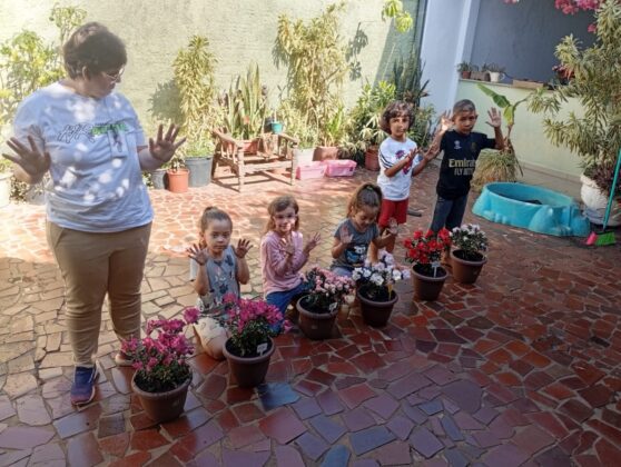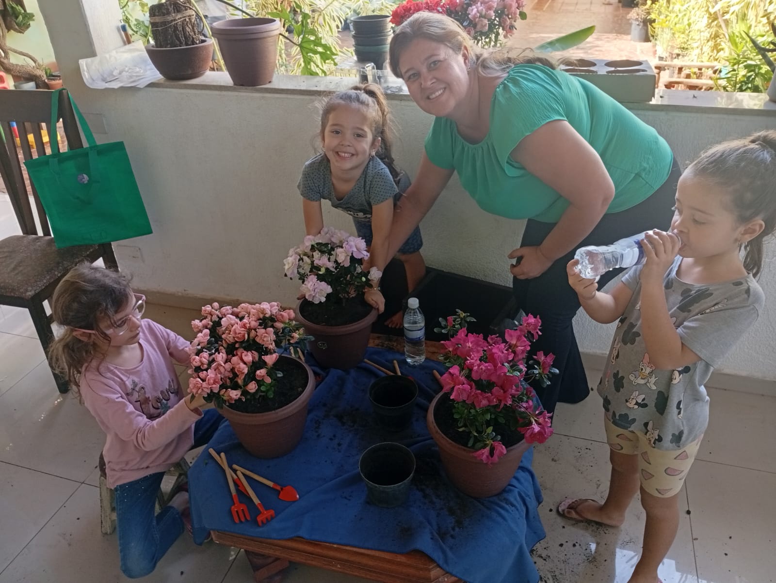 As crianças puderam escolher suas próprias mudas, plantar e aprender sobre o cuidado com as flores, em uma experiência que uniu contato com a natureza, autonomia de escolha e convivência em grupo