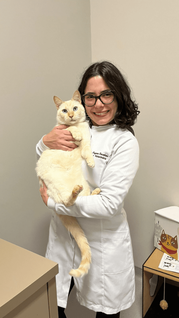 A Dra. Nayara destaca a importância de conversar com o médico veterinário antes de adotar um novo gato para avaliar medidas preventivas contra possíveis doenças infecciosas e definir um protocolo de vacinação e controle de parasitas.