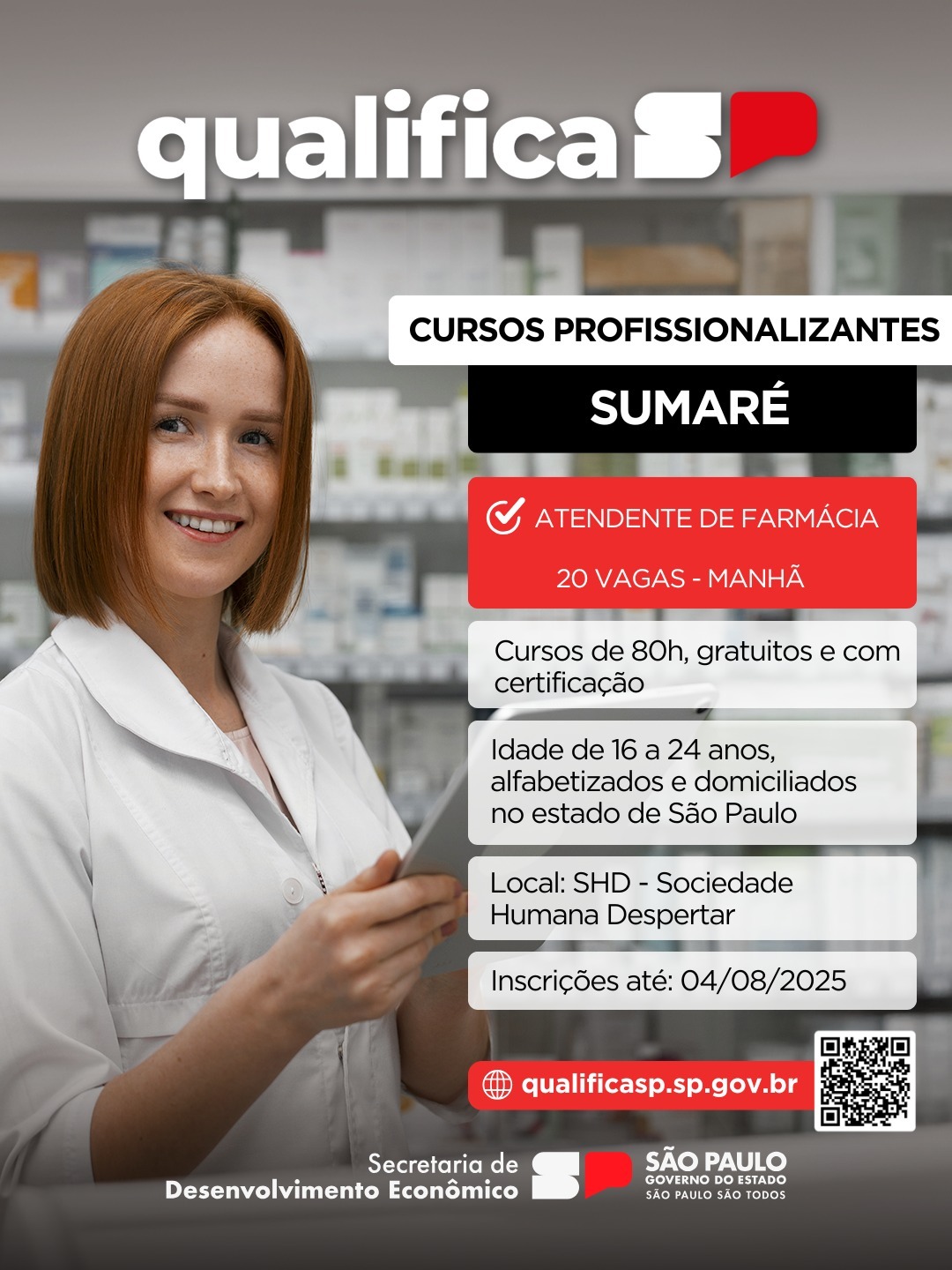 Em Sumaré, os cursos oferecidos são Atendente de Farmácia e Assistente Financeiro, com aulas presenciais ministradas no período da manhã. As instituições de ensino responsáveis são reconhecidas e contam com o apoio da SHD – Sociedade Humana Despertar, que cedeu o espaço para as aulas, localizado na Rua dos Pinheiros, nº 105, Jardim Basilicata.