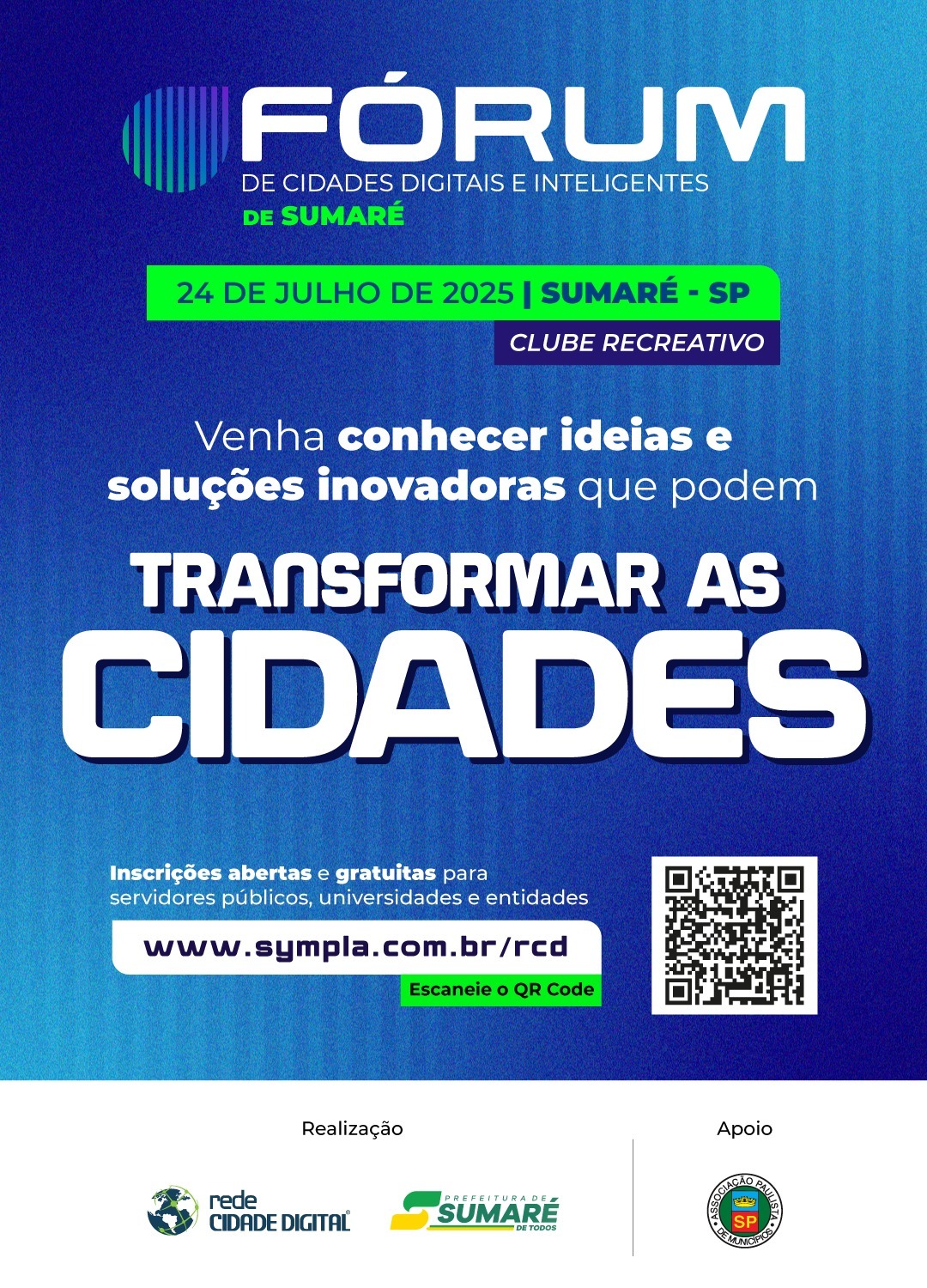 No dia 24 de julho de 2025, Sumaré sediará o Fórum de Cidades Digitais e Inteligentes, evento gratuito que reunirá gestores da Região Metropolitana de Campinas para debater tecnologia e inovação na gestão pública.