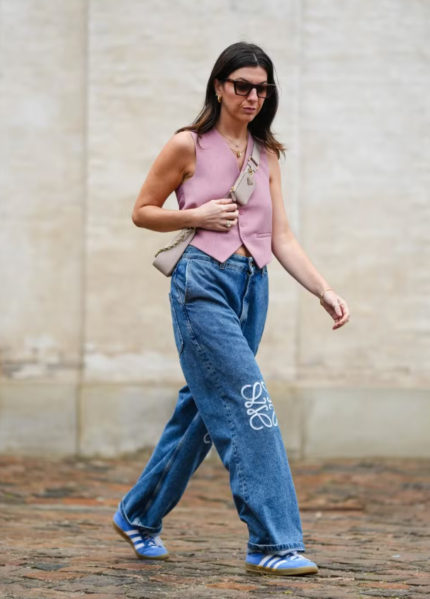 - Tênis Azuis com Jeans Largos: Uma escolha despojada e confortável para o dia a dia.