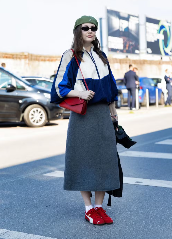 - Tênis Vermelhos com Saia Mídi: Uma combinação perfeita para criar um visual moderno e sofisticado.