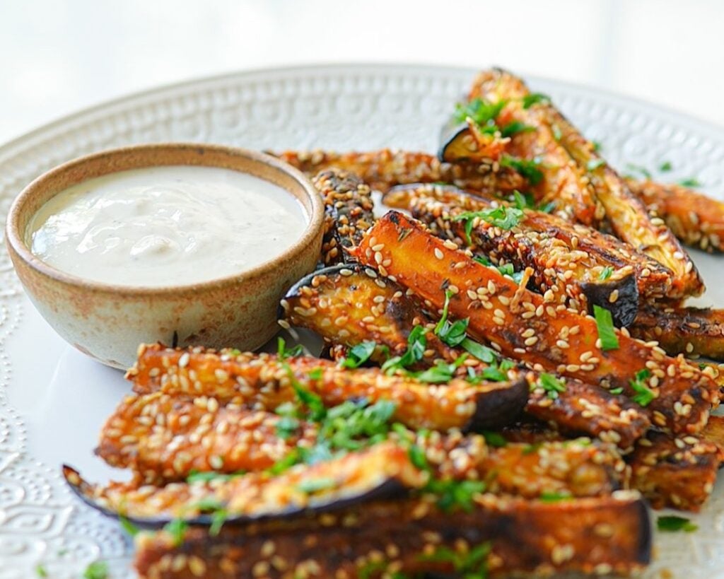 Corte a berinjela em palitos e envolva-os em uma mistura que garante sabor e crocância antes de levar à airfryer.