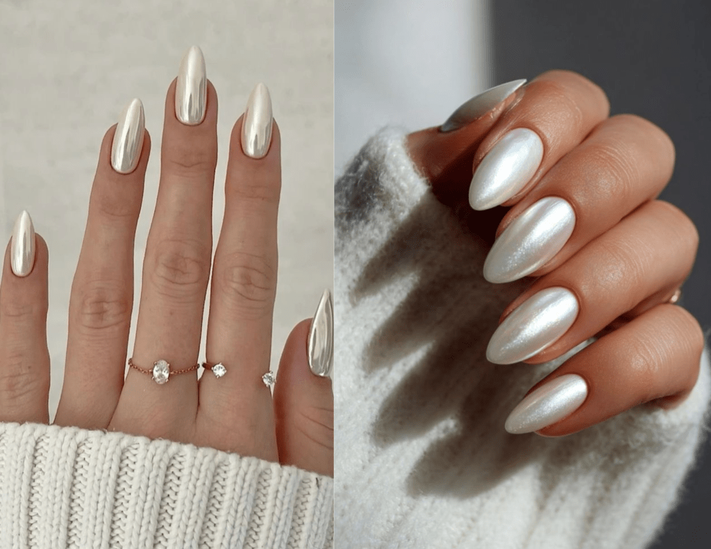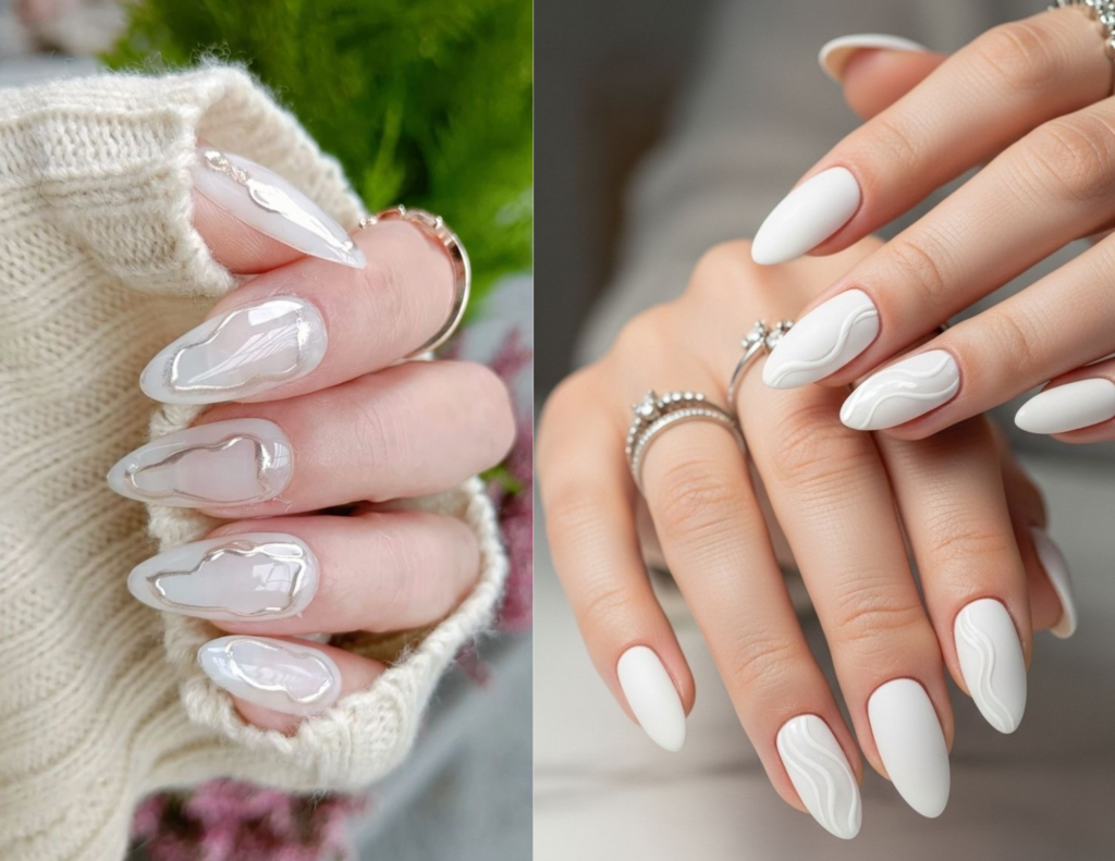 O efeito, que lembra a estética glazed donut, traz um glow cintilante que deixa a mão mais chic e feminina. Use pó ou pigmento perolado para dar profundidade e transformar o branco em protagonista.