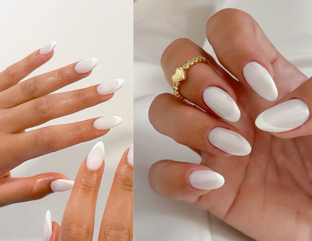 Pode aparecer com base branca total ou com a ponta mais marcada, seguindo a tendência do branco 2026 de forma suave e refinada.