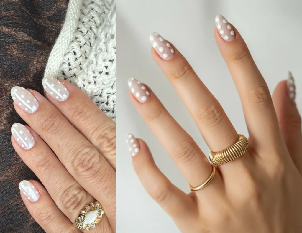 Sobre a base branca, bolinhas pretas criam um visual marcante, divertido e fashionista — o contraste deixa a unha moderna, fresca e com um toque gráfico.